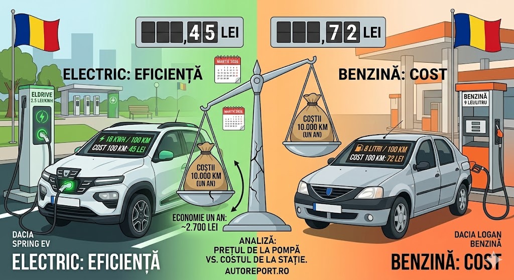 În martie 2026, peisajul mobilității din România arată radical diferit față de acum câțiva ani. Cu un preț al benzinei care a atins pragul de 9 lei pe litru din cauza tensiunilor din Orientul Mijlociu și cu tarifele rețelelor de încărcare rapidă (precum Eldrive) stabilizate la 2,5 lei per kWh, calculul rentabilității a devenit o probă de matematică pură pentru orice șofer.