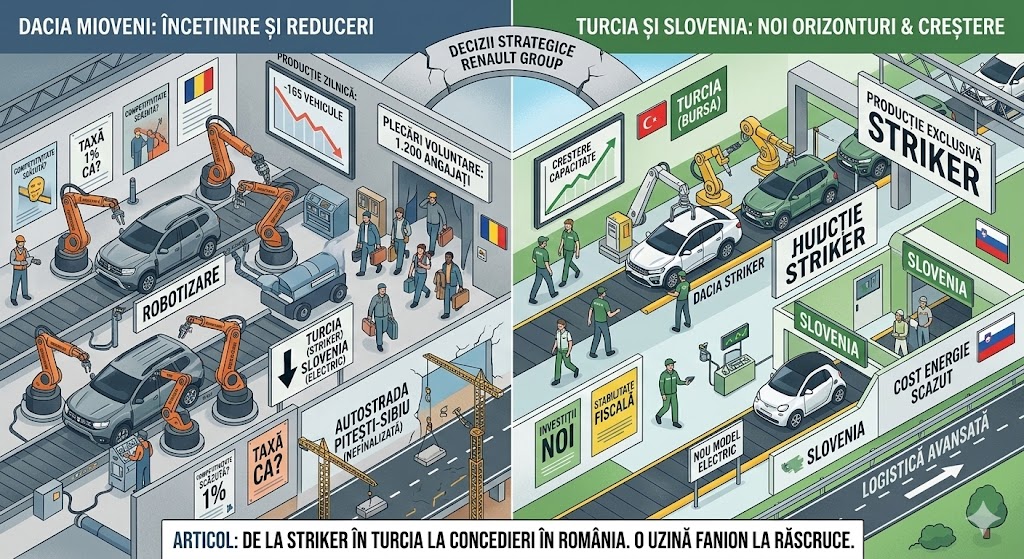 Uzina Automobile Dacia de la Mioveni, „motorul” industriei auto românești, traversează în martie 2026 una dintre cele mai delicate perioade din istoria sa recentă. Ceea ce se anunța a fi o campanie anuală de plecări voluntare s-a transformat, conform sindicatelor, într-un semnal de alarmă privind viitorul producției în România.