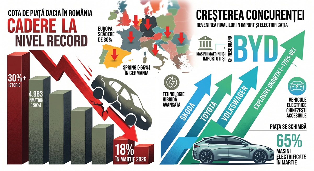 Marca de la Mioveni traversează unul dintre cele mai dificile momente din istoria sa recentă. Combinația dintre creșterea prețurilor, asaltul mărcilor chinezești și problemele majore de aprovizionare a provocat o cădere liberă a vânzărilor Dacia la începutul anului 2026. În România, cota de piață a atins un minim istoric, în timp ce pe plan european, brandul înregistrează cele mai mari scăderi din rândul constructorilor de volum.
