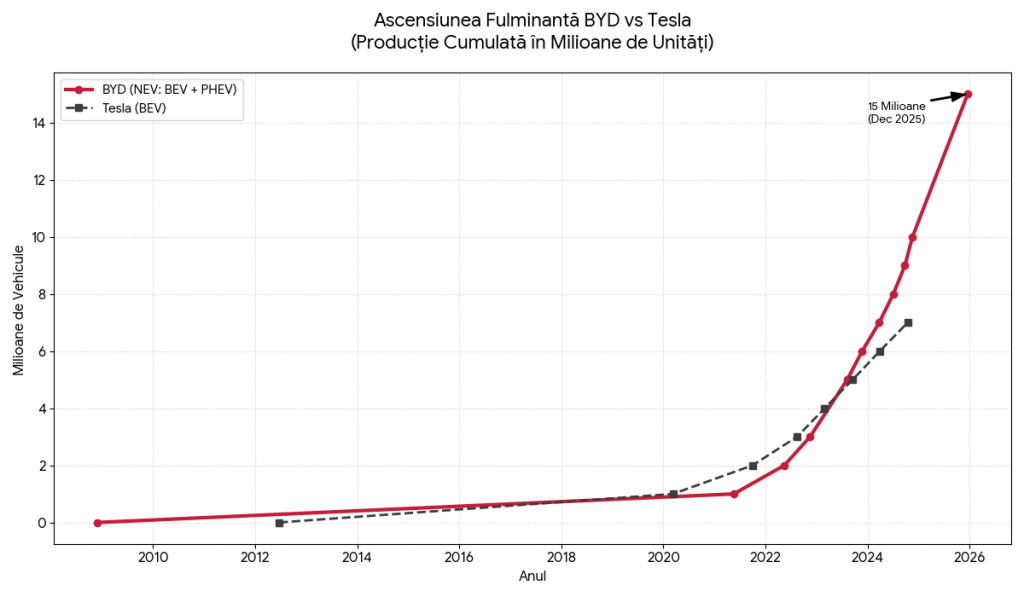 - Accelerarea Exponențială: BYD a avut nevoie de 13 ani (2008-2021) pentru a produce primul milion de vehicule electrificate. Totuși, saltul de la 10 la 15 milioane a fost realizat în doar 13 luni. Această pantă aproape verticală a producției este fără precedent în istoria modernă a automobilului.