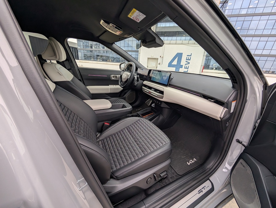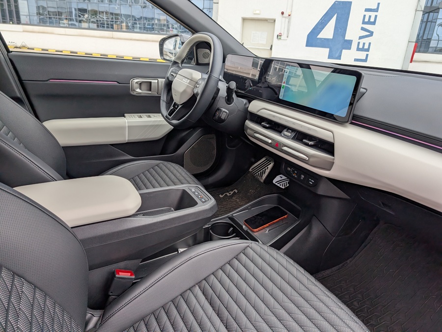 Interiorul este un spațiu plăcut, ergonomic și aerisit, dominat de ecrane clare și comenzi tactile bine plasate. Materialele sunt durabile și plăcute la atingere, iar scaunele oferă un suport excelent, crucial pentru un test de 600 km.