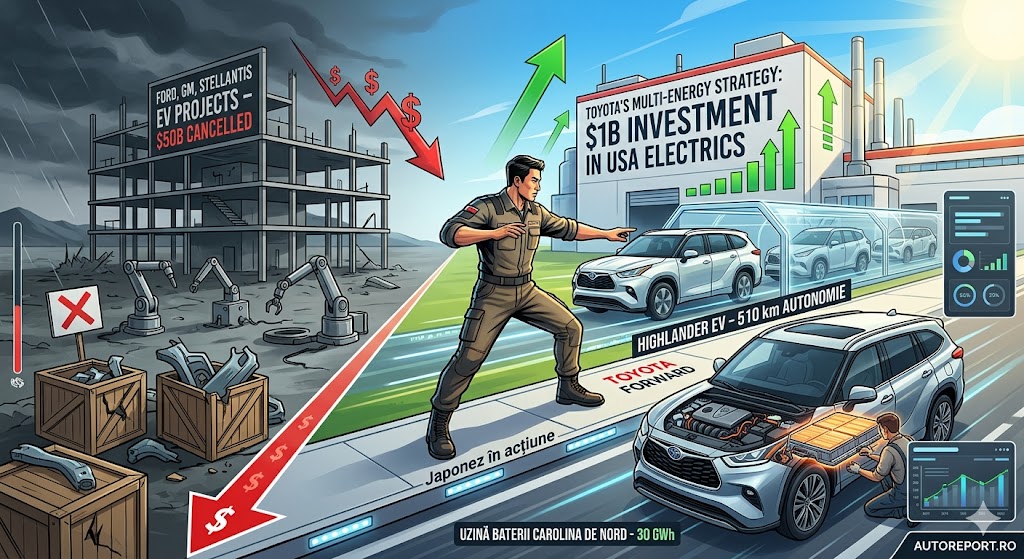 În timp ce giganții din Detroit (Ford, GM și Stellantis) taie bugete de miliarde și anulează proiecte EV de teama tarifelor impuse de administrația Trump, Toyota execută o manevră surprinzătoare. Gigantul japonez mizează un miliard de dolari pe piața americană, demonstrând că viziunea „multi-energie” nu înseamnă abandonarea electricelor, ci o lansare calculată matematic.