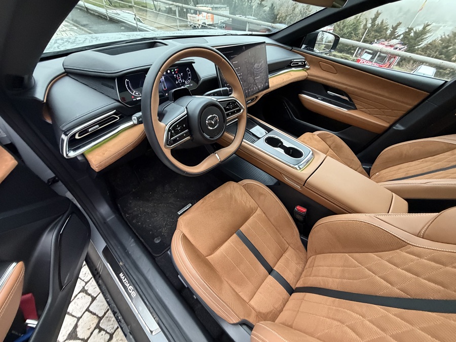 Ceea ce m-a impresionat cu adevărat este manevrabilitatea. Mazda a reușit să păstreze acea conexiune om-mașină (Jinba Ittai), direcția fiind precisă și comunicativă. Pe virajele de la intrarea în Ploiești, mașina stă plat, fără ruliu deranjant, oferind o agilitate care te face să uiți că te afli la volanul unui sedan de dimensiuni generoase. Distribuția greutății și setarea suspensiei fac din 6e una dintre cele mai manevrabile electrice din segmentul său.