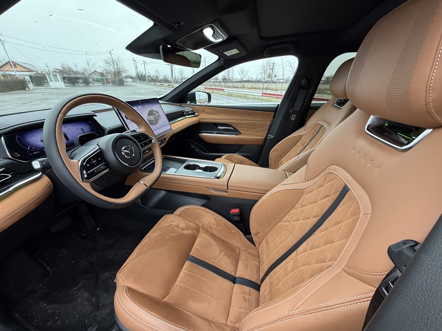 Confortul la rulare este punctul forte. Mazda 6e înghite denivelările de pe DN1 cu o eleganță specifică segmentului premium, iar izolarea fonică transformă habitaclul într-o oază de liniște, chiar și la viteze de autostradă.