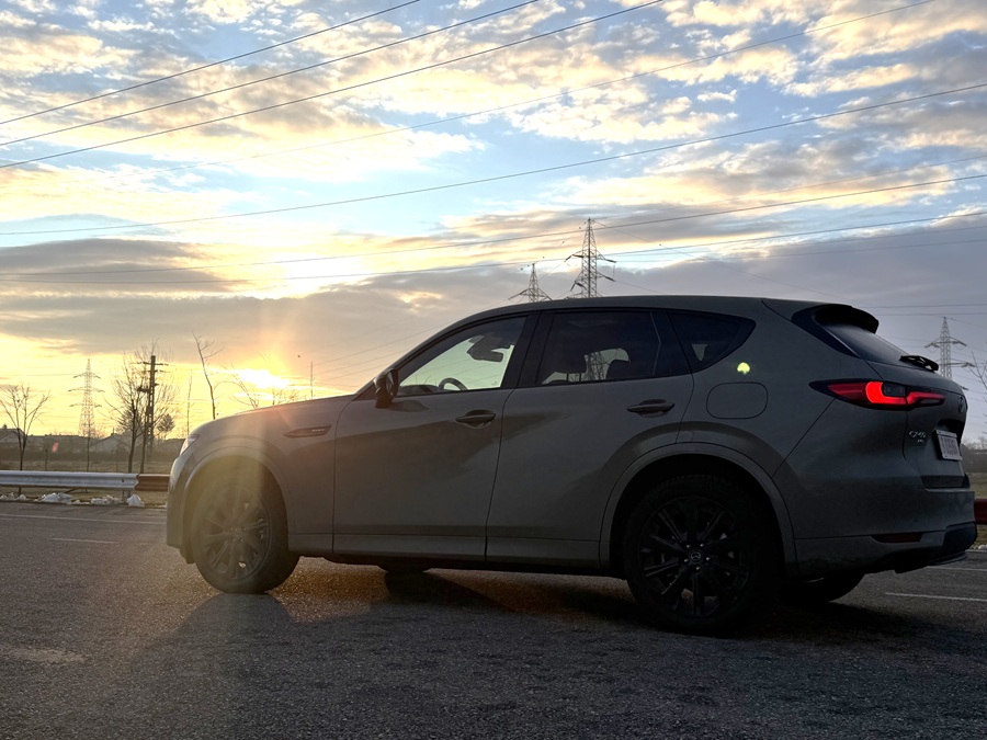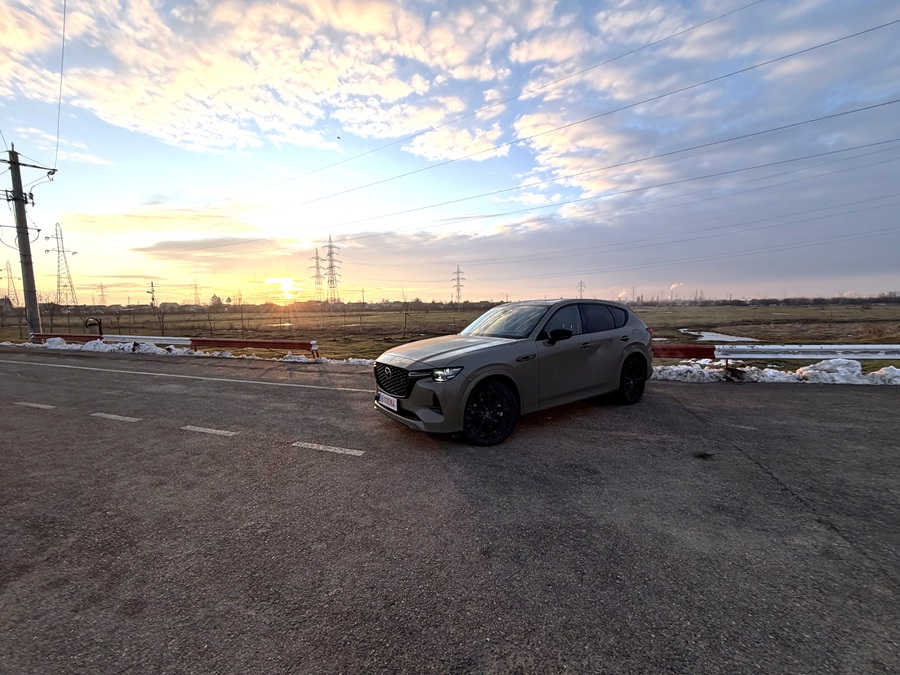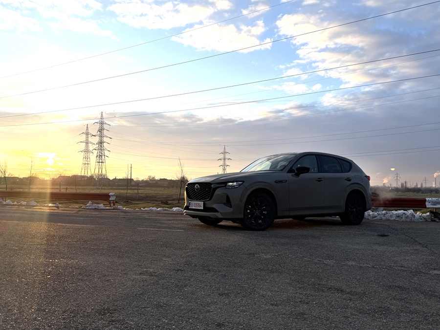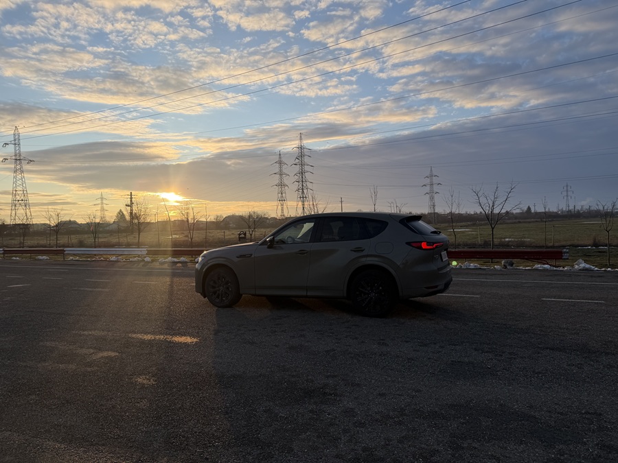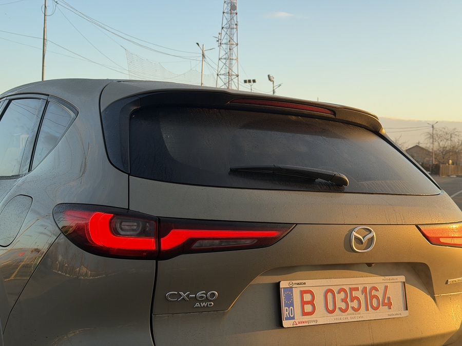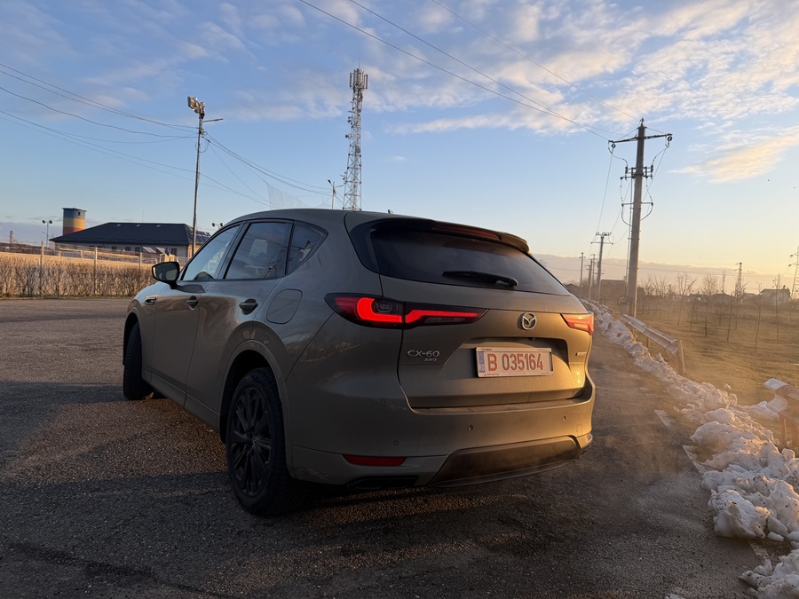 La prima vedere, CX-60 2026 păstrează designul Kodo sobru și impunător, însă nuanța Zircon Sand Metallic a exemplarului de test îi conferă o notă de aventură sofisticată. Modificările aduse blocurilor optice față și spate sunt discrete, dar eficiente, oferind mașinii o semnătură luminoasă mai tech.