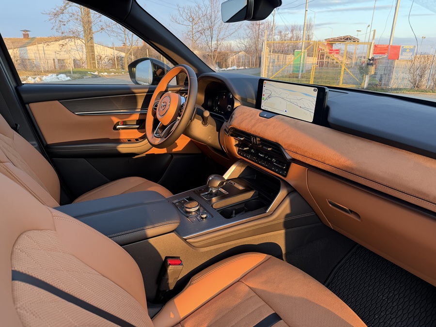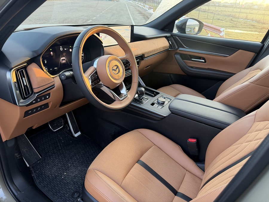 La plecarea din București, cu bateria de 17.8 kWh încărcată, am rulat pur electric până la ieșirea spre autostradă, obținând o autonomie reală de aproximativ 52 km în condiții de trafic urban. Odată ajunși pe autostrada A3, sistemul hibrid face trecerea între cele două motoare aproape imperceptibil. Inovația majoră pentru 2026 constă în conformitatea cu standardul de poluare Euro 6e, demonstrând angajamentul Mazda pentru emisii reduse fără a sacrifica performanța (0-100 km/h în doar 5.8 secunde).