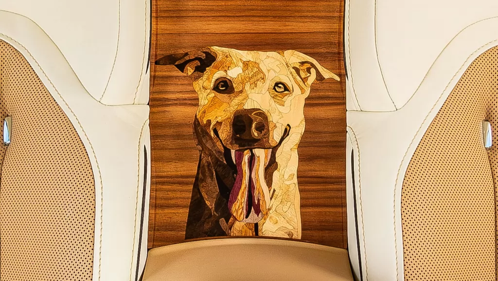 Elementul central și cel mai spectaculos al personalizării se află între scaunele din spate: un portret al lui Bailey, realizat nu din vopsea, ci din intarsii de lemn (marchetărie).