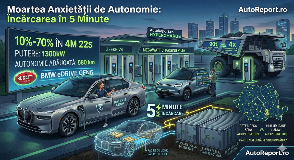 Ultimele săptămâni au fost martorele unei curse a înarmărilor tehnologice fără precedent. De la recordul de încărcare stabilit de Geely (Lynk & Co), care a reușit un incredibil 10-70% în puțin peste 4 minute, până la noile baterii cilindrice dezvoltate de BMW în parteneriat cu Rimac, paradigma s-a schimbat. Nu mai vorbim despre „dacă” mașina electrică este practică, ci despre „cât de repede” poate rețeaua noastră să susțină această viteză.