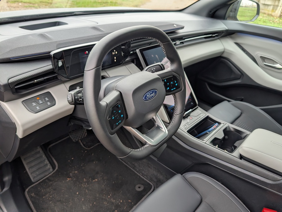Deși este un SUV, Ford a reușit să îi confere un comportament rutier surprinzător de compus. Manevrabilitatea este mai bună decât la mulți rivali din segmentul său. Centrul de greutate jos (datorită bateriei) și suspensiile bine calibrate fac ca ruliul caroseriei să fie bine controlat în viraje, oferind o senzație de precizie și implicare la volan, caracteristică modelelor Ford. Servodirecția este bine echilibrată și oferă un feedback decent.
