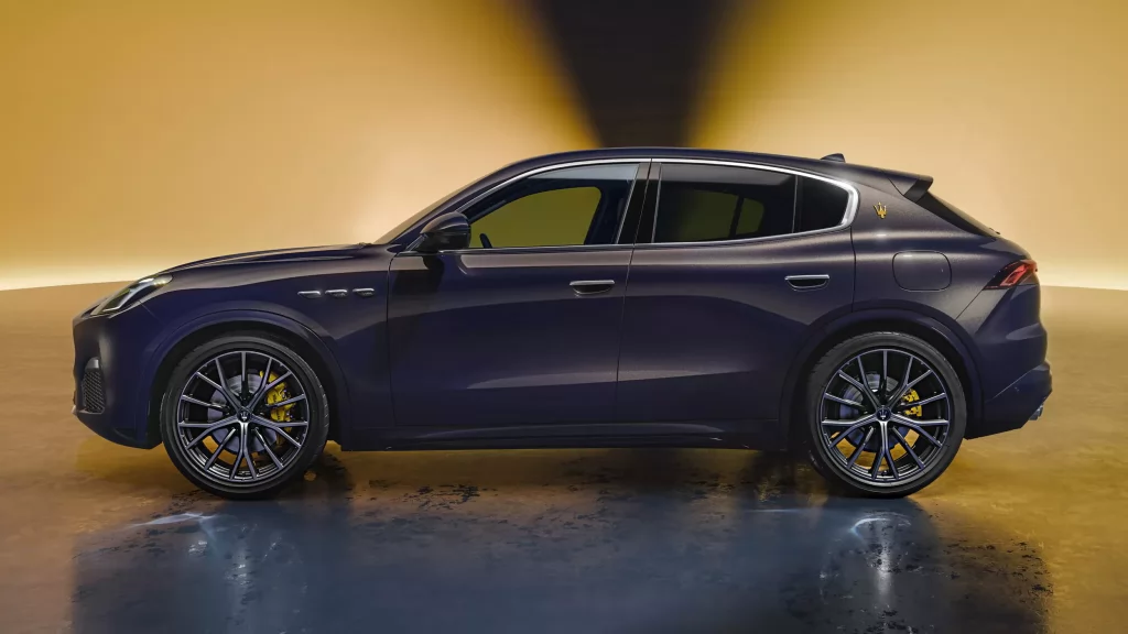 - Roți și Accente: SUV-ul rulează pe jante Pegaso de 21 de inchi, asortate cu etriere de frână de culoare galbenă și emblemele Trident de pe montanții C în aceeași nuanță.