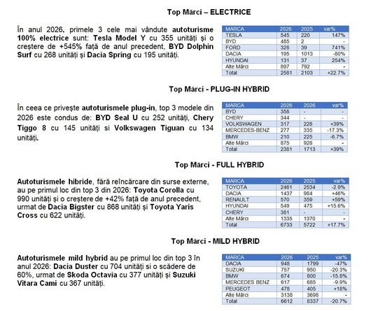 - Autoturismele full-hibrid (FHEV) înregistrează o creştere de +46%, cu o cotă de piaţă de 26%;