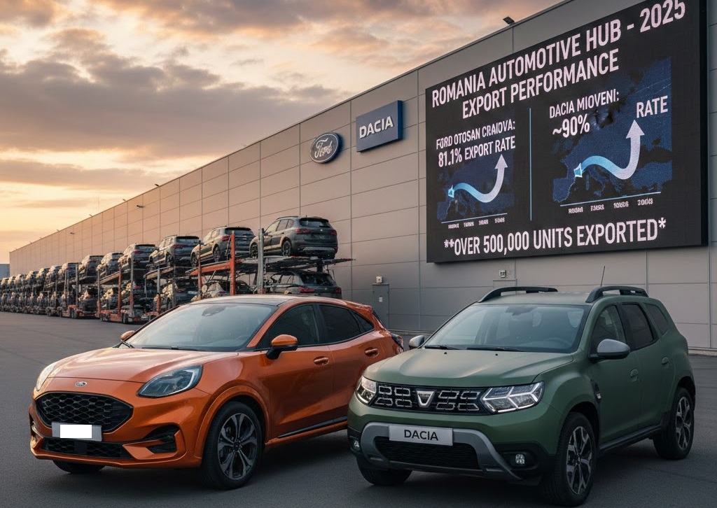 Industria auto din România își confirmă în 2025 rolul de „motor” economic orientat către exterior. Cele două mari uzine, Dacia (Mioveni) și Ford Otosan (Craiova), au asamblat în primele 11 luni ale anului peste 505.000 de vehicule, marea majoritate a acestora fiind livrate clienților din afara granițelor.